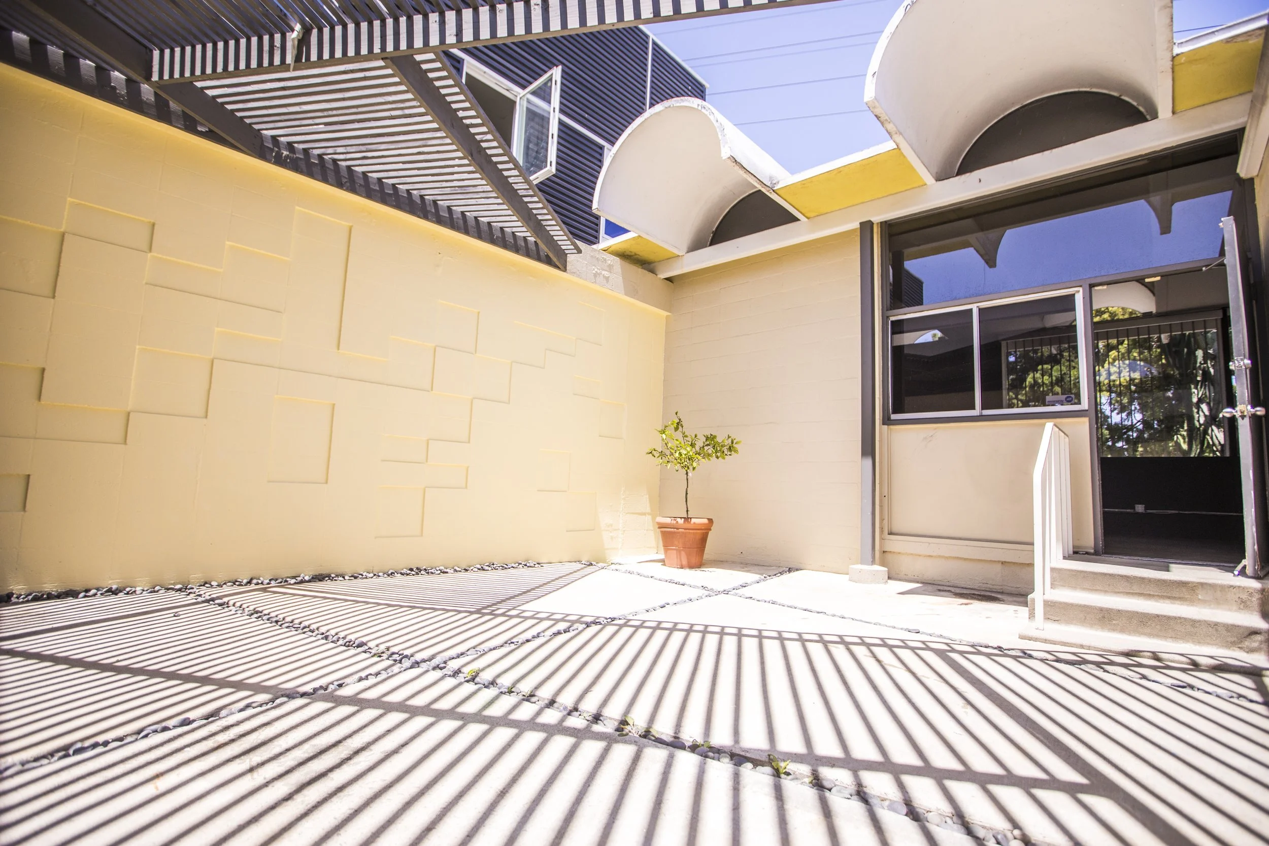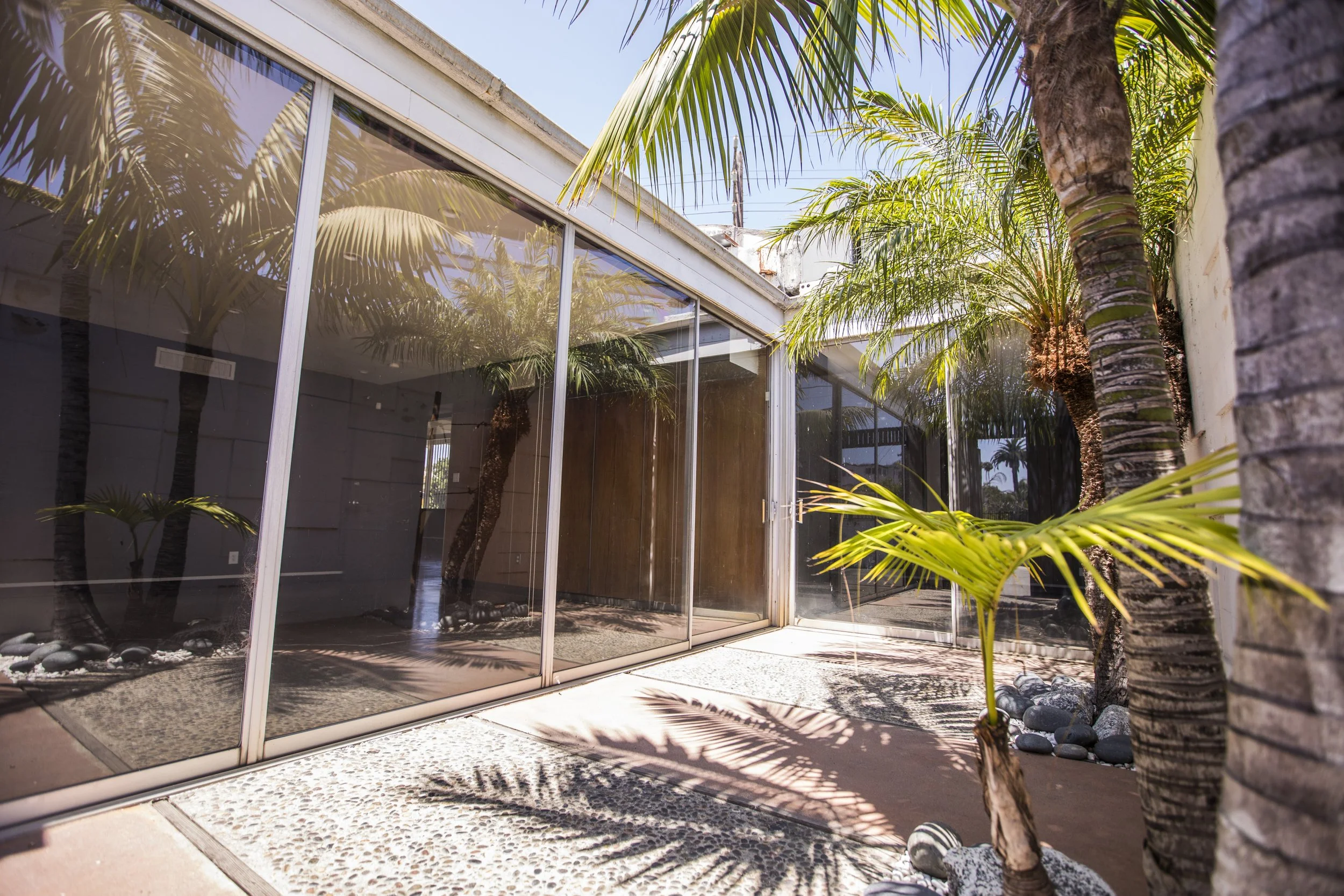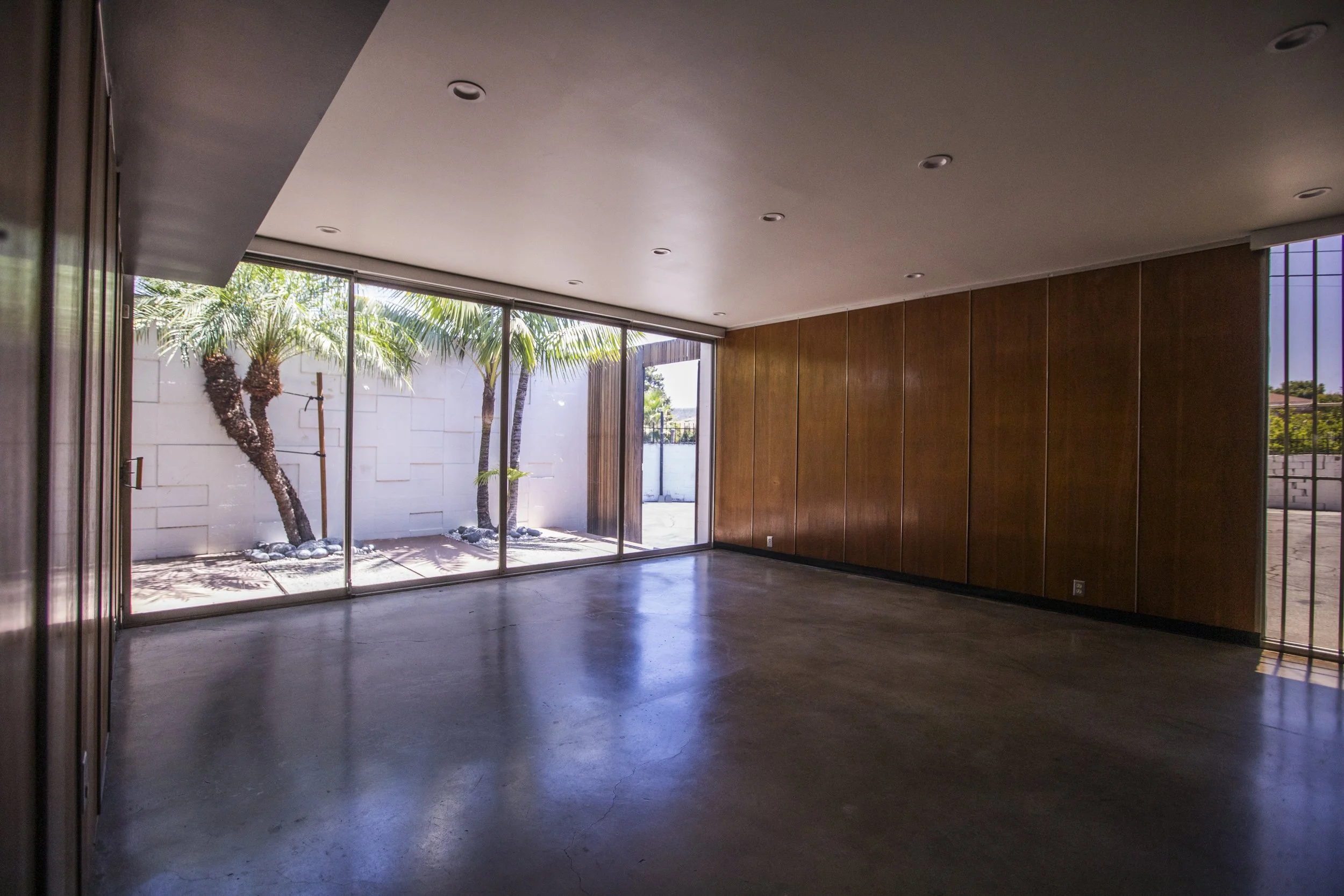 Textured walls deliver a great backdrop and the courtyard is the ideal area for soft lighting scenarios. Two private patios, approximately 418 square feet, contribute to the retro vibe and provide a great space to get fresh air.