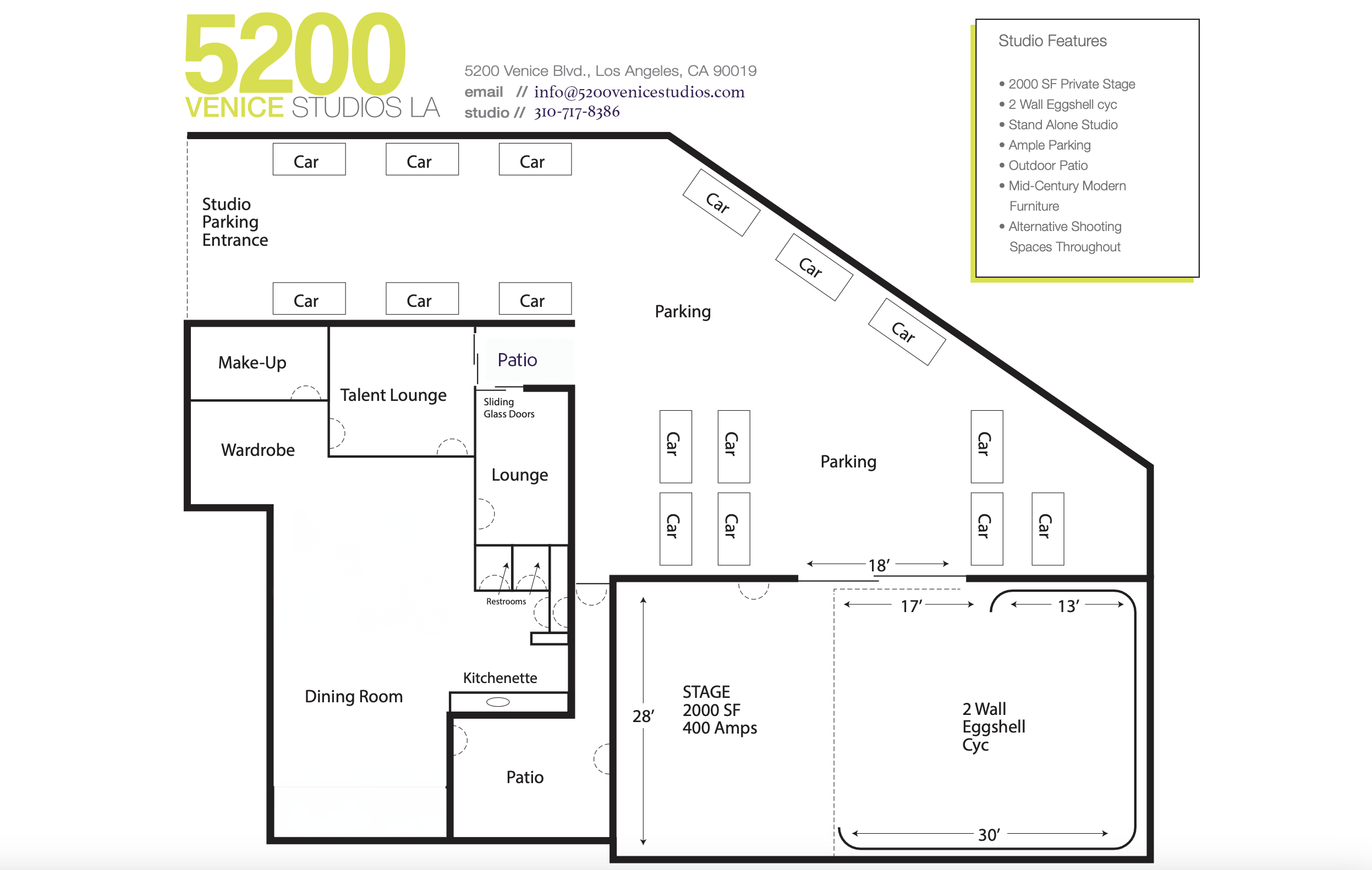 Our outdoor studio space includes a spacious concrete lot that can be used for production or for vehicle parking, loading, or unloading. The gated, private parking lot can accommodate up to 16 cars.